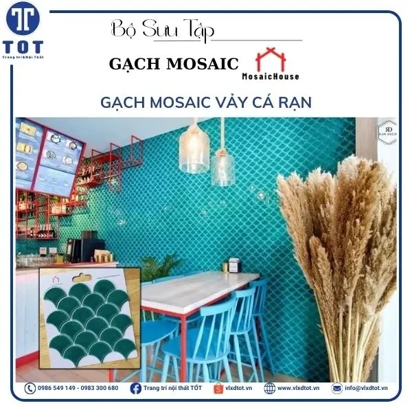 Gạch mosaic vảy cá có thiết kế độc đáo, giúp tạo điểm nhấn ấn tượng cho không gian ứng dụng. Bạn có thể sử dụng gạch vảy cá ốp bếp, phòng tắm, trang trí phòng khách, phòng ngủ.