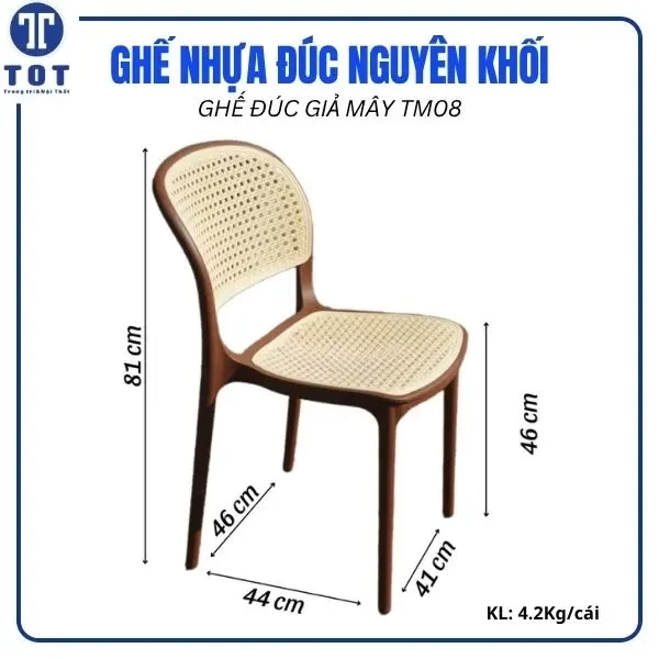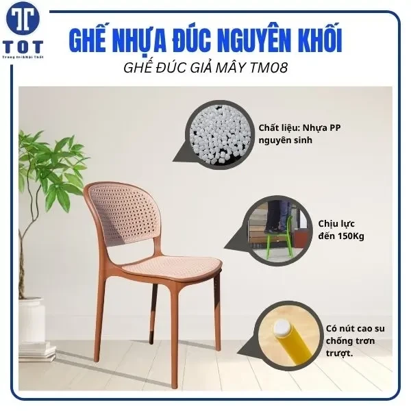 Tóm lại, ghế nhựa đúc giả mây cao cấp TM08 không tay là sự kết hợp hoàn hảo giữa thiết kế hiện đại, tính năng bền bỉ và sự tiện lợi. Sản phẩm này không chỉ mang lại thẩm mỹ mà còn đảm bảo sự thoải mái tối đa trong quá trình sử dụng.