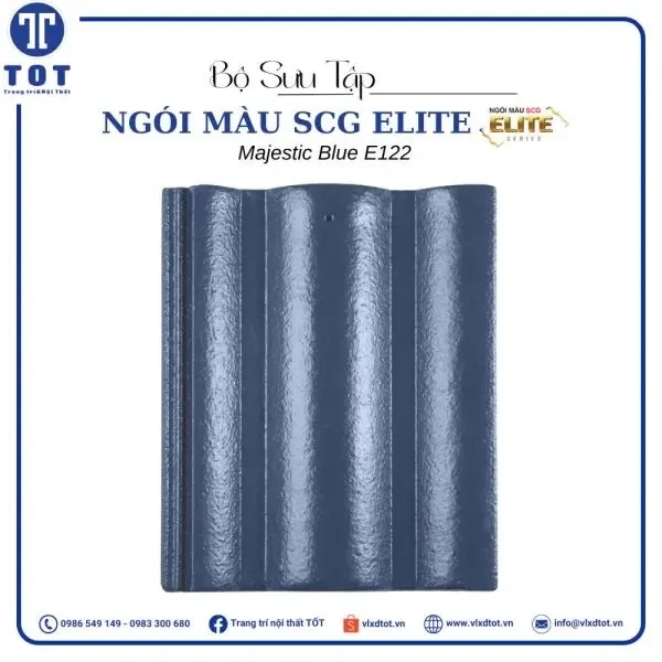 Ngói màu SCG Elite Màu Majestic Blue E122 là mẫu ngói lợp thuộc nhóm Gold Collection màu Xanh Thịnh Vượng (Majestic Blue). Với đột phá từ công nghệ phủ màu 3 lớp, Công nghệ phủ màu Double Coating mang đến viên ngói với nhiều ưu điểm vượt trội: